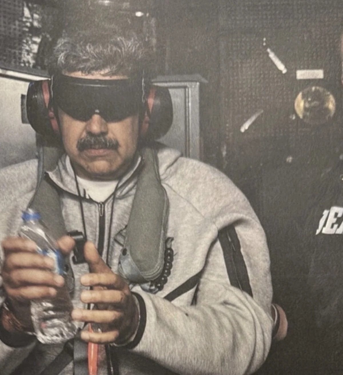 Fotoğrafta, Maduro’nun gözleri ve kulakları kapatılmış şekilde DEA ajanıyla birlikte görülüyor.