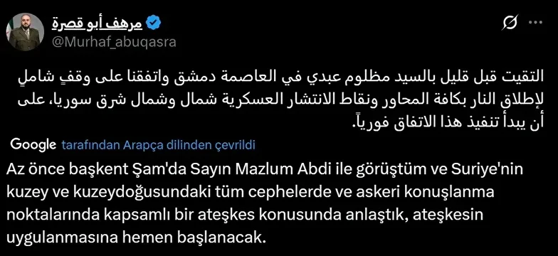“Şam’da Mazlum Abdi ile görüştüm ve Suriye’nin kuzeyi ile kuzeydoğusundaki tüm cephelerde ve askerî konuşlanma noktalarında kapsamlı bir ateşkes konusunda anlaştık; bu anlaşmanın uygulanmasına derhal başlanacaktır.”