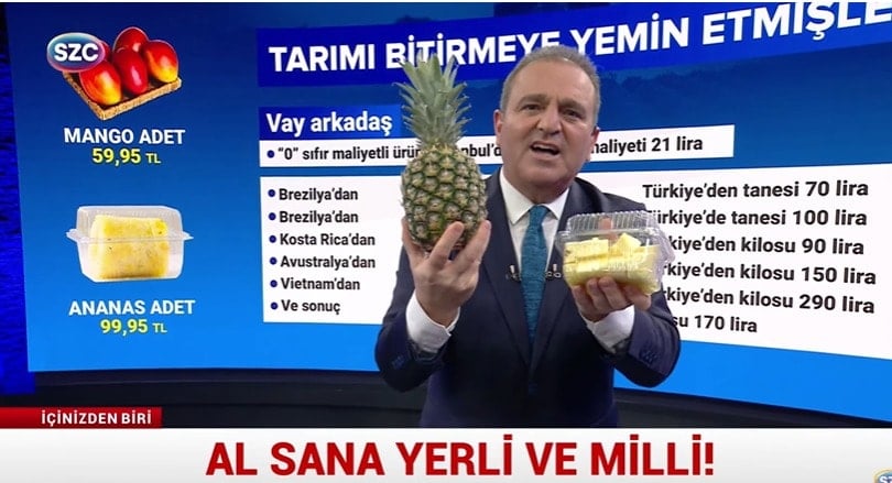 “- Değerli SÖZCÜ TV izleyicileri, Türkiye’de iktidar tarımı bitirmeye niyet etmiş gibi. Ananas Türkiye’de de ekilip biçiliyor ama ta uzaklarda Brezilya’dan da geliyor. O zaman soru şu, Brezilya’dan gelen ananas Türkiye’deki ananastan ucuz olabilir mi? Oluyor.