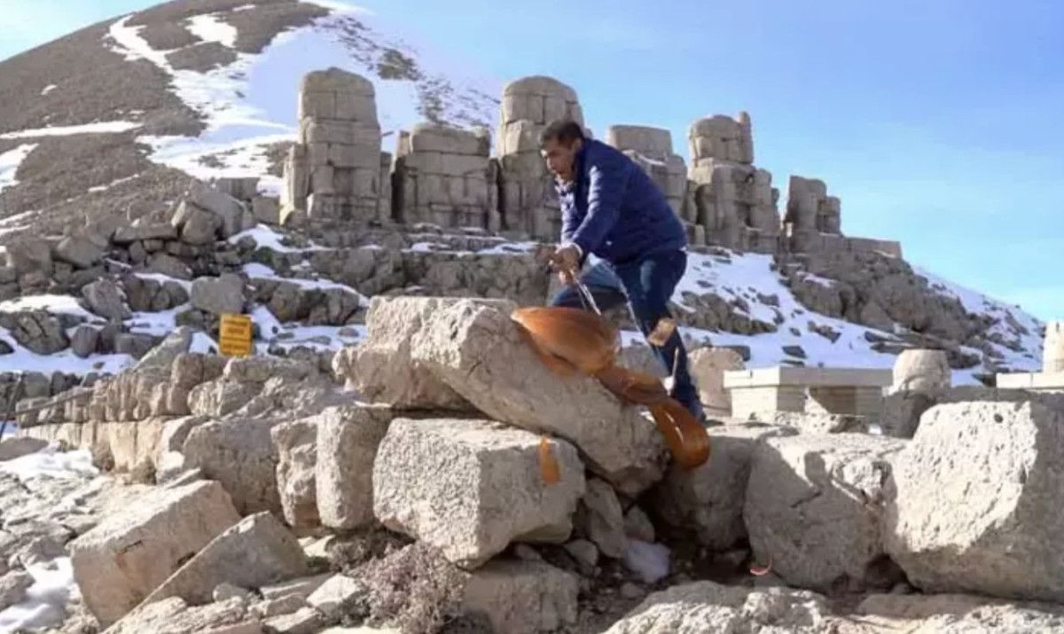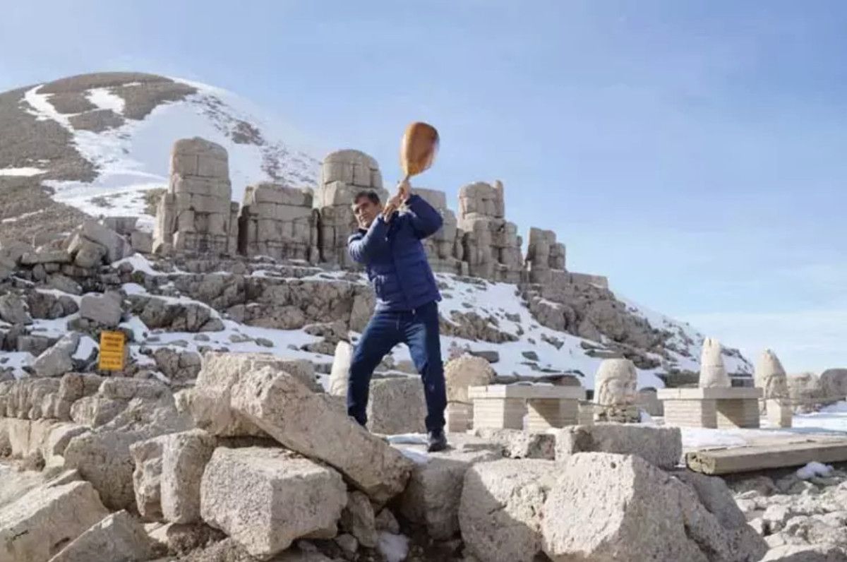Nemrut Dağı’na tırmanan Aydın, buradaki tarihi varlıklara vura vura elindeki sazını paramparça etti.