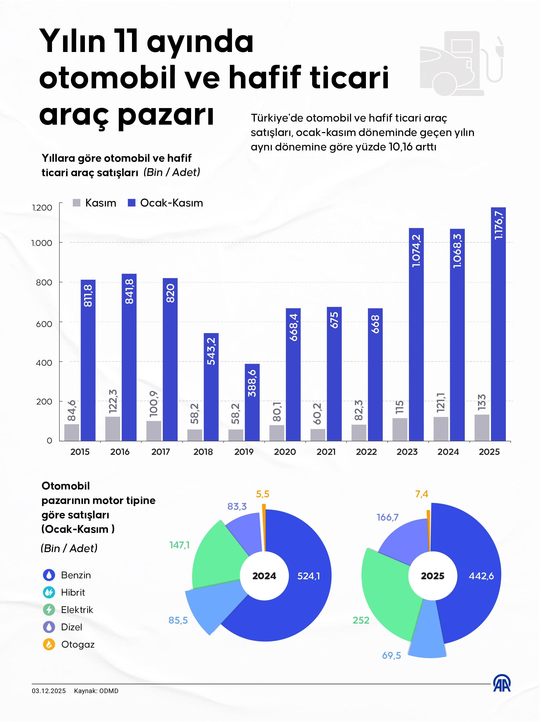 Otomotiv Distribütörleri ve Mobilite Derneğinin (ODMD) Kasım 2025 verilerine göre, otomobil satışları, ocak-kasım döneminde geçen yılın aynı dönemine kıyasla yüzde 10,96 artarak 938 bin 177, hafif ticari araç satışları da yüzde 7,13 yükselerek 238 bin 603 adet olarak gerçekleşti. Satılan otomobil ve hafif ticari araç sayısı aynı dönemde yüzde 10,16 artarak 1 milyon 176 bin 780 oldu.
